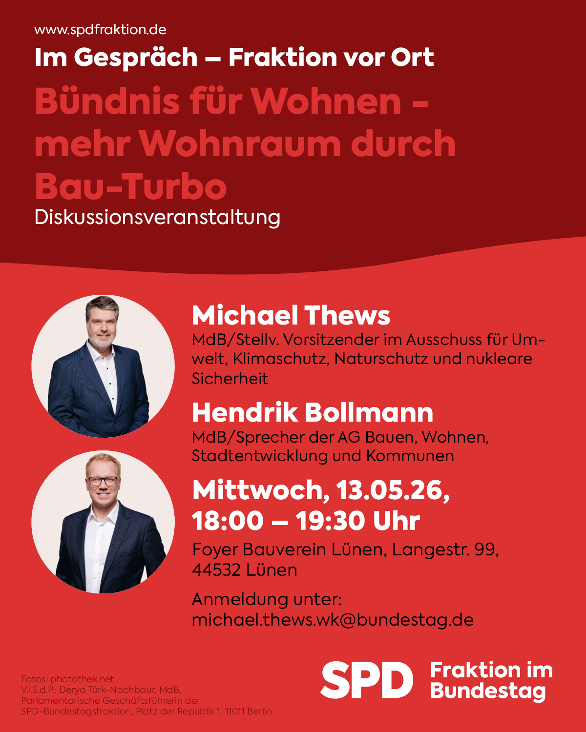Vor diesem Hintergrund lädt die SPD-Bundestagsfraktion zu einer öffentlichen Dialogveranstaltung nach Lünen ein, bei der aktuelle Herausforderungen und konkrete Lösungsansätze diskutiert werden. Im Mittelpunkt stehen unter anderem die Beschleunigung von Bauverfahren, die Stärkung des sozialen Wohnungsbaus, die Unterstützung kommunaler Wohnungsunternehmen sowie klimagerechtes und ressourcenschonendes Bauen. Auch der Schutz von Mieterinnen und Mietern wird ein zentrales Thema sein.