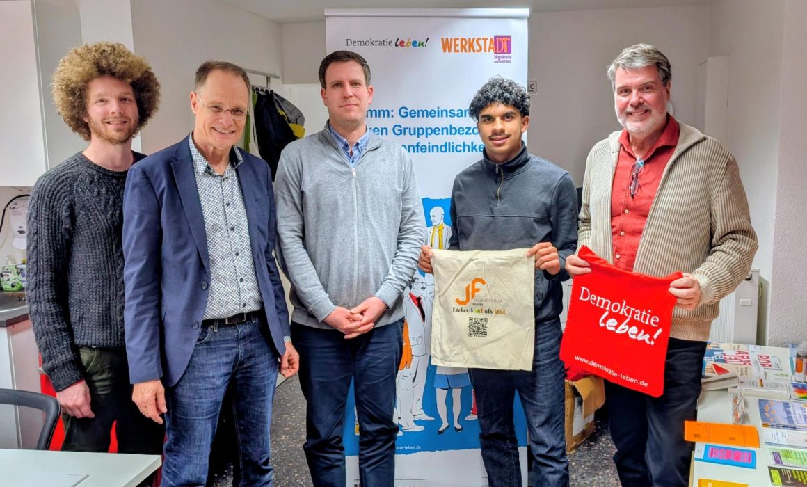 Der Bundestagsabgeordnete Michael Thews (rechts) besuchte das Team der Werkstadt für Demokratie und Toleranz mit (von links) Jakob Schirmböck, Tilman Walther-Sollich, Frederic Grimm sowie Salih Kadrija für das Jugendforum Hamm.